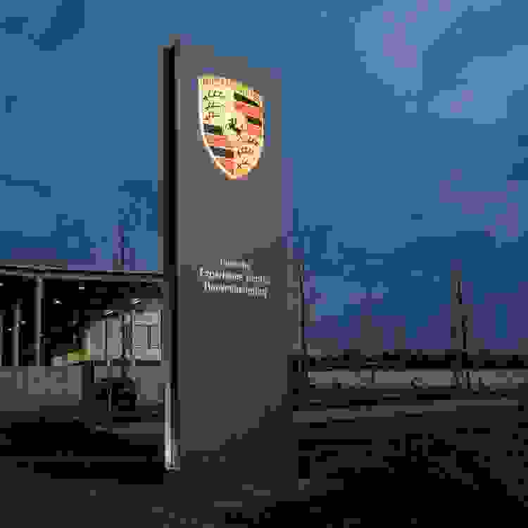 Auf den Sichtseiten des Pylons ist jeweils das Porsche Wappen sowie der Schriftzug Porsche Experience Center Hockenheimring integriert. Das Wappen besteht aus hinterdrucktem und anschließend thermisch verformtem glasklaren Acryl. Der oberflächenbündig intarsierte Schriftzug ist in Black & White Acryl umgesetzt. Innenliegende LEDs sorgen für eine homogene Ausleuchtung von Wappen und Schriftzug. Zudem wird der Pylon seitlich jeweils mittels vier 3 Watt LEDs mit aufgesetzten Linsen angestrahlt, die eine asymmetrische Lichtsäule erzeugen. Dabei nimmt der Helligkeitsverlauf nach oben hin ab, um nicht mit dem Logo zu konkurrieren.