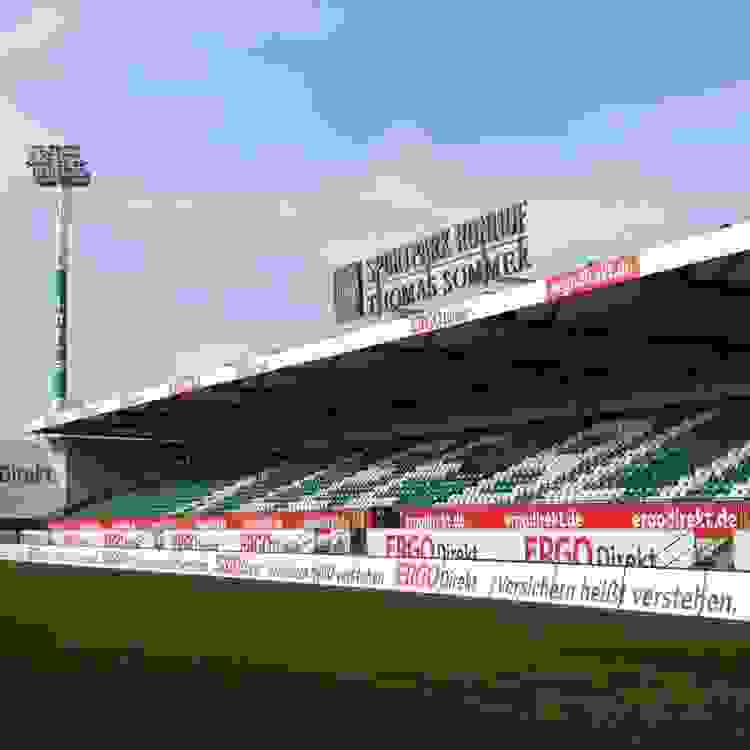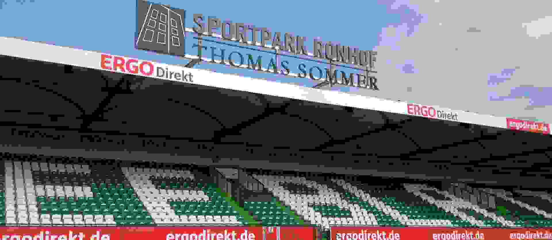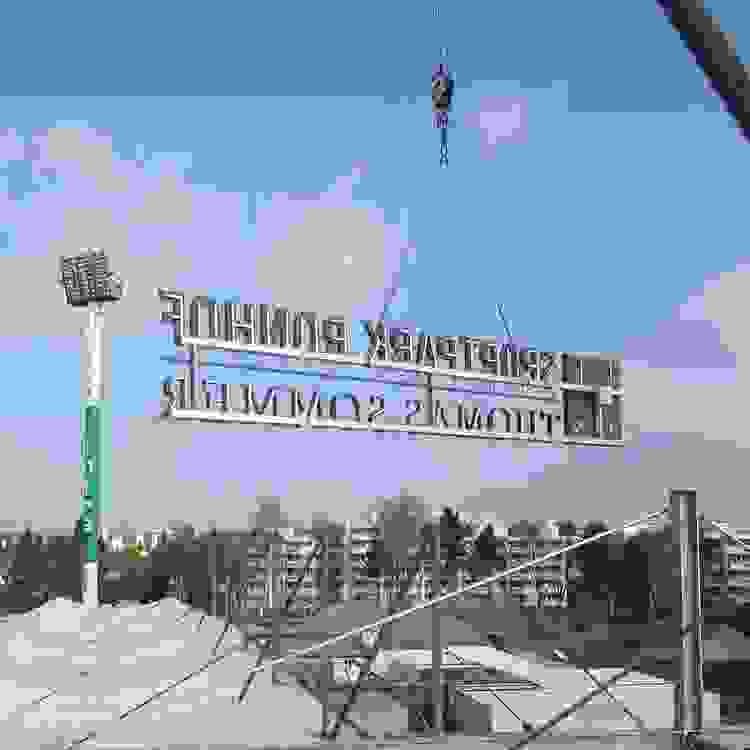 Dank der hervorragenden Zusammenarbeit von Statiker, Betreiber und Stahlbaugewerk konnten wir die Werbeanlage spielend auf dem Stadiondach am Fürther Ronhof verankern. Mit schwerem Gerät hoben wir die 18 m breite und 3 m hohe Anlage auf das Dach und befestigen diese von der Montagegondel aus an der schwer zugänglichen Stelle oberhalb des Tribünendachs.