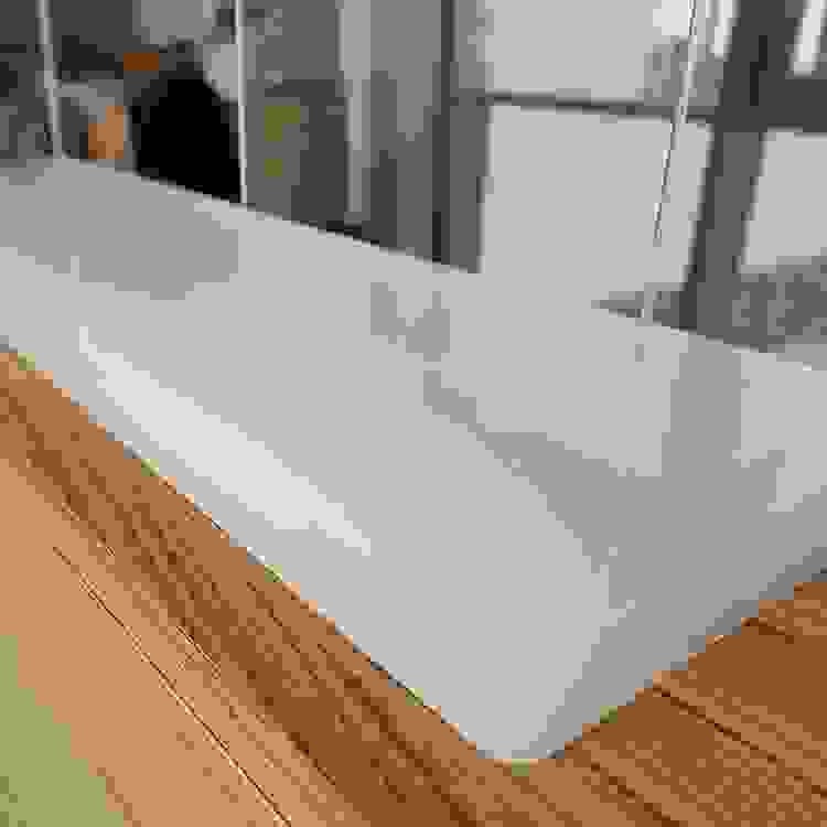 Klares Acrylglas mit Durchreiche, Standfuß aus 30 mm starkem, satiniertem Acrylglas